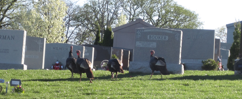 We drove through the narrow roadways and came across an ominous flock of turkeys, out for a stroll among the graves… just like us.